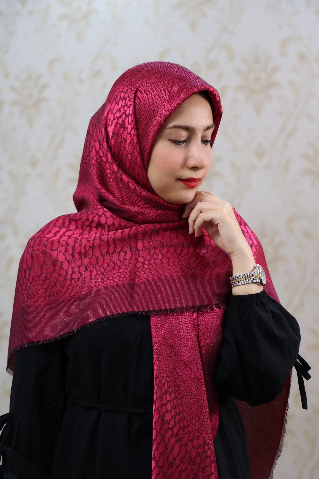 روسری ژاکارد رنگ صورتی طرح گل رز